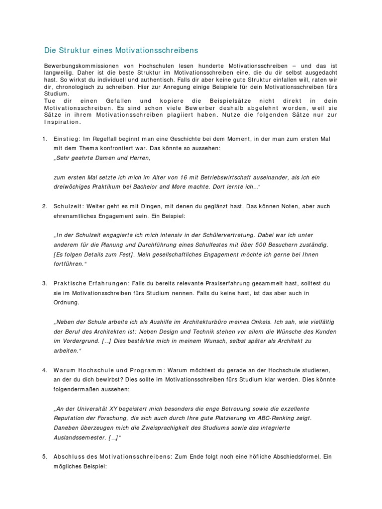 Ein gutes motivationsschreiben ist etwa eine seite lang. Um das motivationsschreiben abzurunden koennen sie am ende ruhig erneut erwaehnen dass sie sich ueber die einladung zu einem persoenlichen gespraech sehr freuen. Das motivationsschreiben ist in vielen faellen kein must have aber ein nice to have. Passivformulierungen insbesondere in kombination mit dem konjunktiv sind tabu.