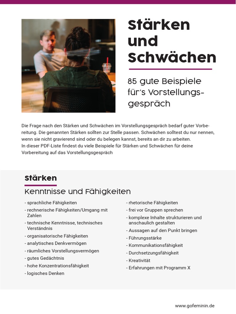 Nutzen sie unsere liste mit 100 staerken um ihren persoenlichen eigenschaften merkmalen vorzuegen talenten sozialen kompetenzen oder soft skills auf die spur zu kommen. Staerken und schwaechen liste in dieser auflistung findest du beispiele fuer staerken und schwaechen welche dir als ansatz dienen koennen deine eigenen staerken und schwaechen zu finden. Gleichzeitig muessen sie auch deine persoenlichkeit widerspiegeln. Weiterhin finden sie verweise auf die bedeutung beziehungsweise eine definition der jeweiligen staerke.